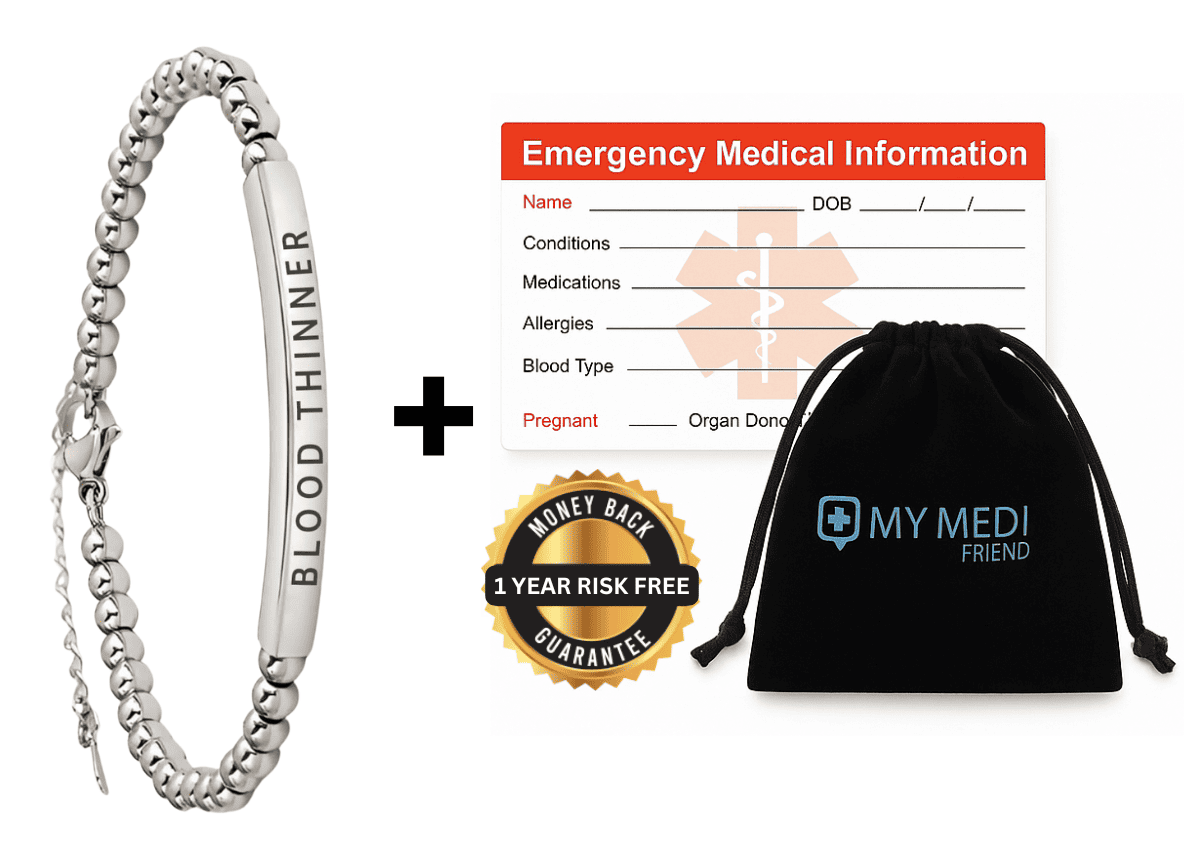 Free Emergency ID Card + Free Premium Bracelet Storage Case + 1 year no questions asked guarantee included.